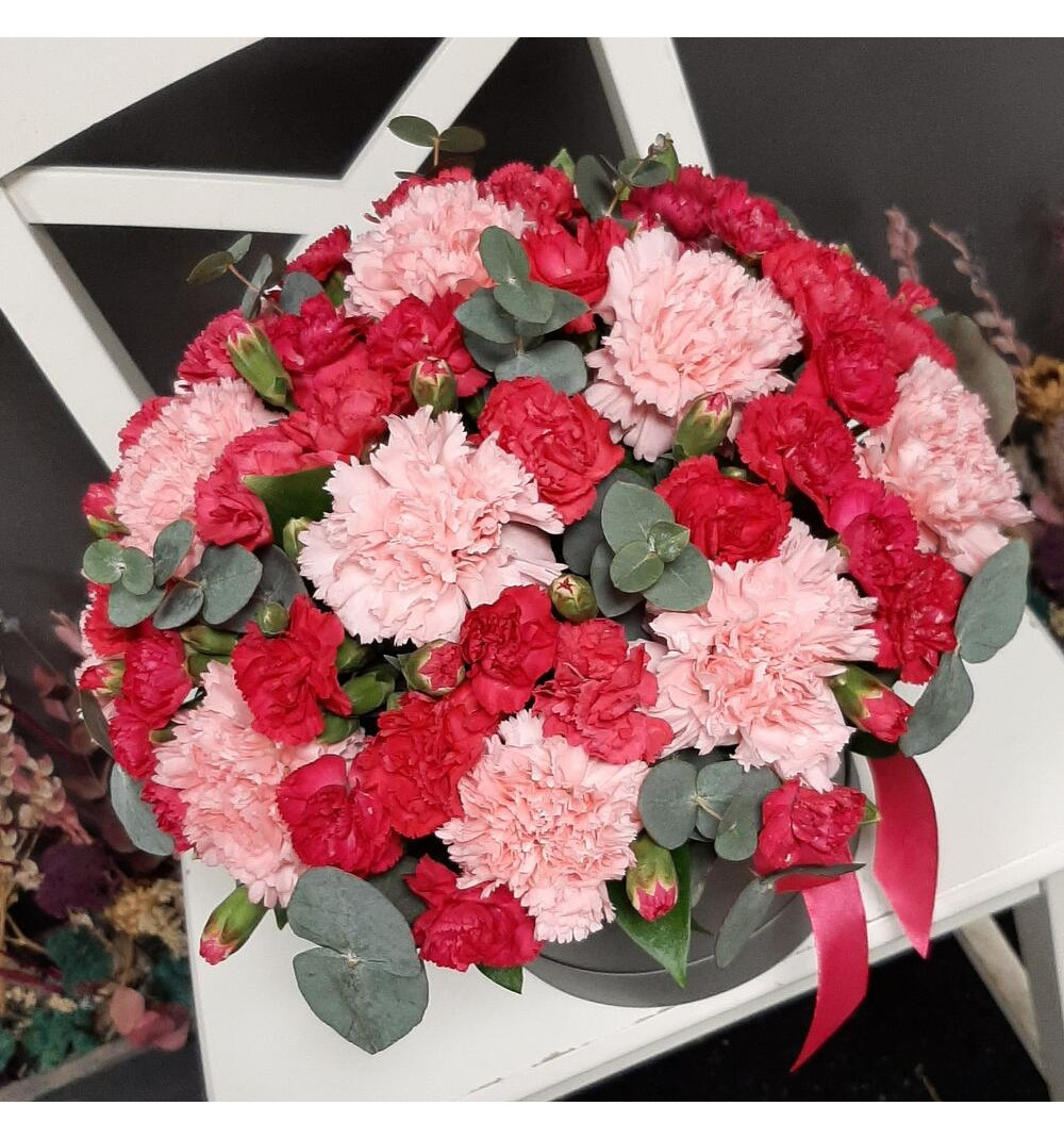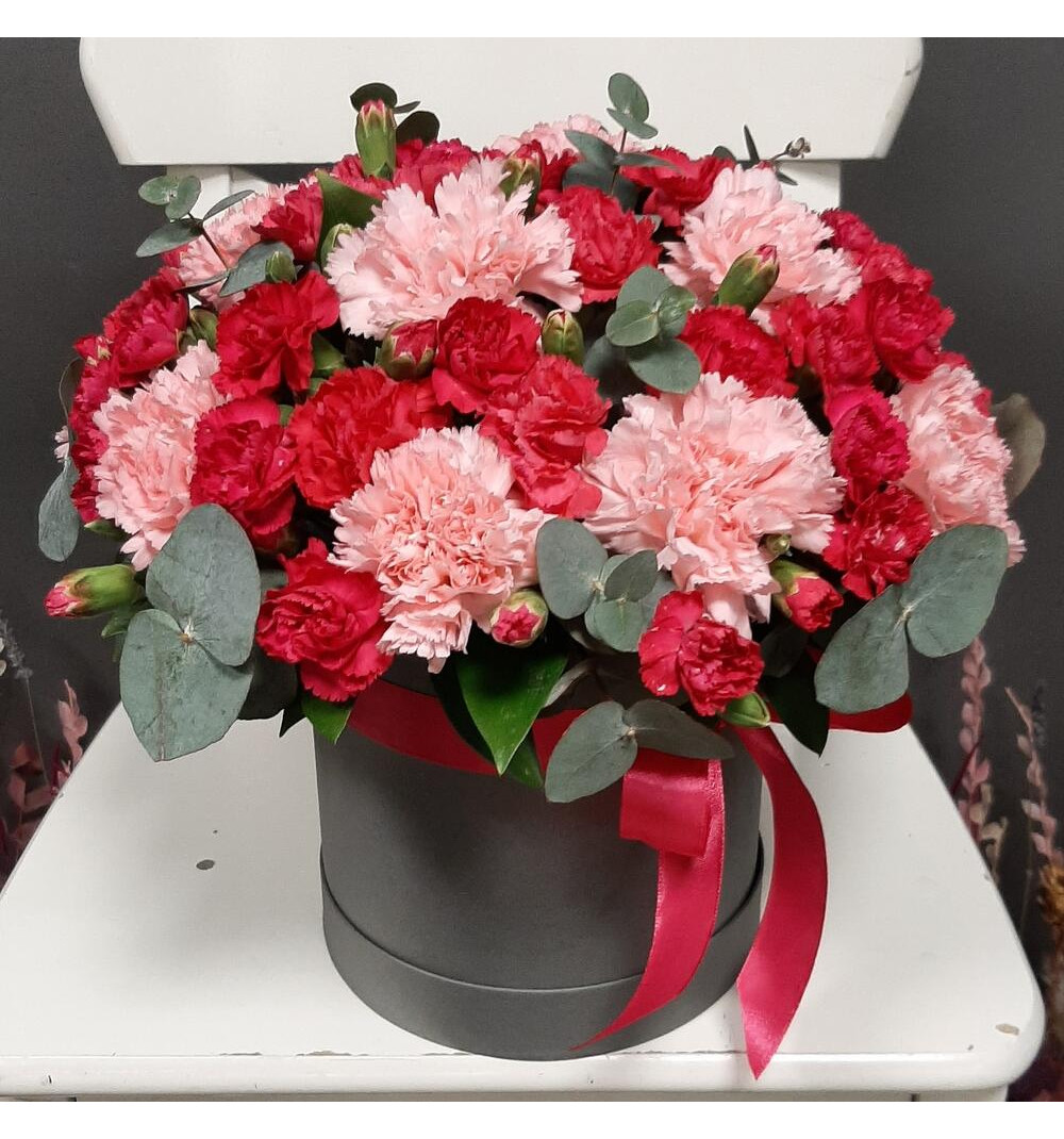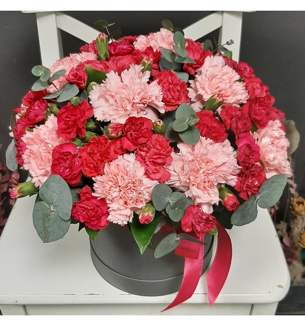 Купить Яркая кустовая и нежно коралловая гвоздика в шляпной коробке в Жанаозене за 25 000 ₸ | интернет-магазин «Guls»